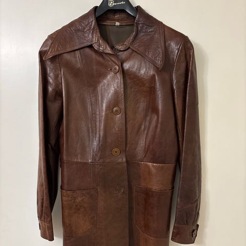 Naisten lyhyt nahkatakki, ruskea. Käytönjälkeä, mutta siisti ja ehjä vuorta myöten. Vanha takki, ehkä 70-luvulta, aitoa nahkaa. Valmistaja- ja kokolaput puuttuvat. Koko noin 38/40. Pituus 64 cm, kai-kai 47 cm.