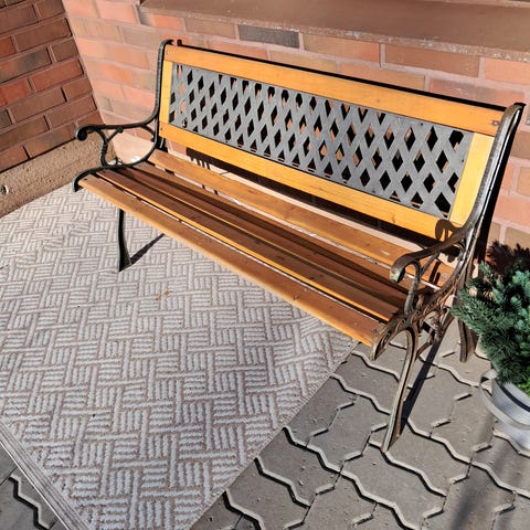 Hyväkuntoinen oliivinvihreä Palissade-penkki. Säilytetty aina talvisin lasituksessa.