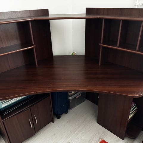 Kulmamallinen työpöytä, jossa puunsävyinen pöytätaso ja valkoiset rungot. Pöydässä on yläosa esimerkiksi näytölle tai tarvikkeille sekä integroidut cd-telineet molemmilla sivuilla. Alatasolla on tilaa tietokoneelle ja muille laitteille, ja toisessa päädyssä on ovellinen säilytyskaappi. Sopii työ- tai tietokonepöydäksi pieneen tilaan, jossa halutaan hyödyntää nurkkatila tehokkaasti.