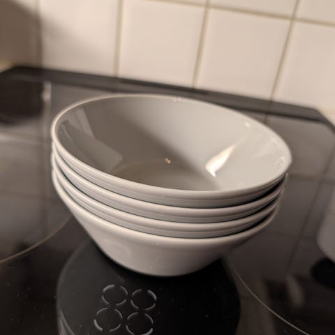 Iittalan Teema-kulhot 4 kpl yhteishintaan. Halkaisija noin 15 cm, korkeus 5,5 cm. Väri valkoinen. Leimat pohjissa kuluneet lähes kokonaan, ja muutenkin käytön jälkeä. Ei mitään lohkeamaa tms, joten hyvät seuraavalle. Tasarahalla Merimiehenkadulta.