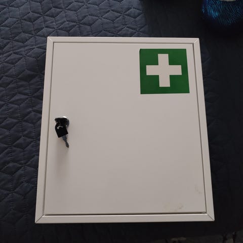 Myydään metallinen hyväkuntoinen kolmella hyllyllä oleva lääkekaappi. Lukkopesä puuttuu. Kiinnitysruuvit mukana. Mitat 50cmx27cmx12cm.