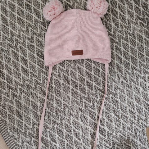 Gugguun vaaleanpunainen puuvillainen tupsupipo nauhoilla koko L. Paljon käytetty. Pieni jälki edessä joka näkyy kuvassa.