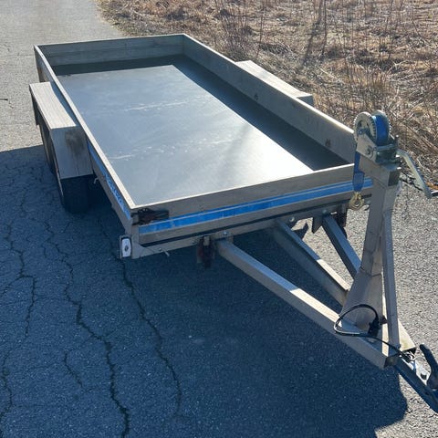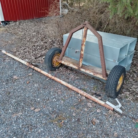 Jykevä vankkurivaunu. Ollut n.8tn 11m veneen alla. Kantavuus n.20tn. Lava 6x2,5m. Säädettävät sivutuet, katkaistava aisa. Ilmapyörät.