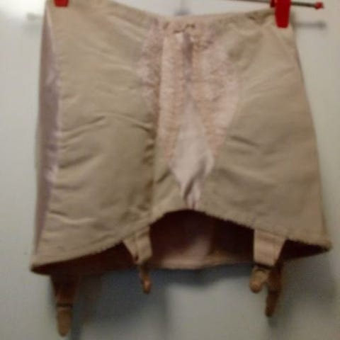 Fortuna- merkkinen sukkanauhaliivi 60-luvulta. Vyötärön ympärys 74cm, lantion hmpärys n 90cm. Koko epävarma M. Materiaali joustaa.