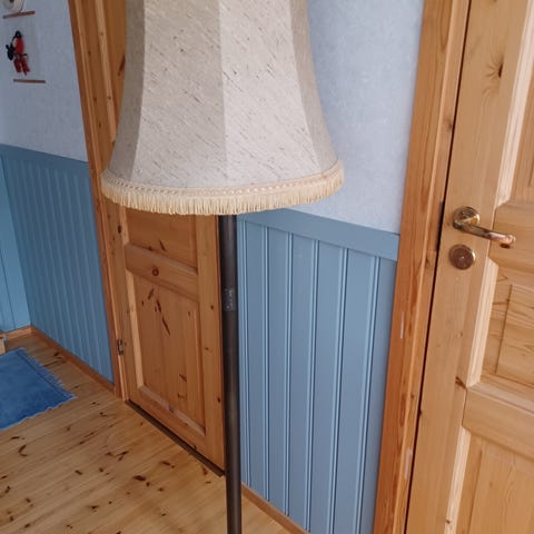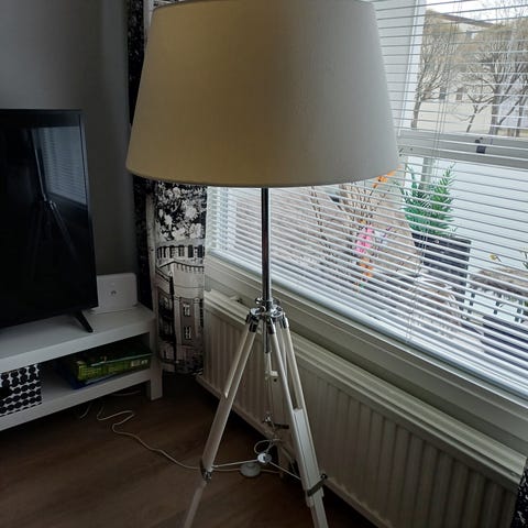 Upea jalkalamppu. Pitkän kaarevan jalan päässä valonlähde. Lämmin valaistus . Katkaisija. Kuin uusi. Uuden hinta noin 300€.