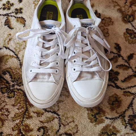 Alunperin valkoiset, nyt on täplää ja laikkua, muuten täysin ehjät ja siistit. Pesemällä puhtaaksi. Vaatii myös uudet nauhat. Tämä kaikki huomioitu hinnassa.Converse tennarit, koko 38. Väri valkoinen. Matalavartinen malli nauhoituksella ja kumipohjalla.