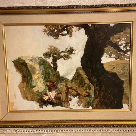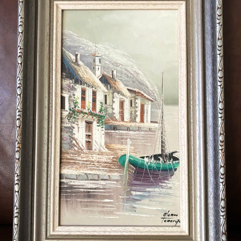 Vanha öljyvärimaalaus, jossa kaupunkimaisema iltahämärässä. Teos on toteutettu tummasävyisin värein ja siinä näkyy rakennuksia, vettä ja taivasta. Maalaus on kiinnitetty leveisiin, luonnonvaaleisiin puukehyksiin, jotka ovat kuluneet. Takana on ripustusnaru seinälle ripustamista varten. Taiteilijan nimi on Andre