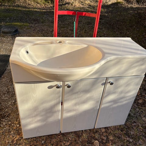 Seinään kiinnitettävä, oras vesihana, kaksi isoa laatikkoa. Kaksi levikettä, joissa mahtava "marmori" väritys.