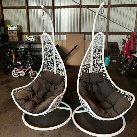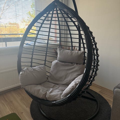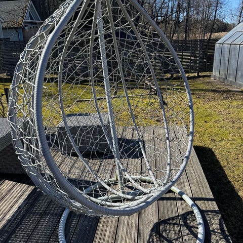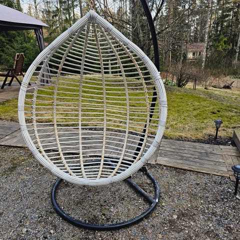 Pyöreä makramee-tyylinen riipputuoli sisä- tai ulkokäyttöön. Tuolissa on verkkomallinen istuinosa ja selkänoja sekä useita ripustusnarua, joilla tuoli kiinnitetään kattoon tai telineeseen. Väri on luonnonvalkoinen/vaalea ja materiaalina paksu köysimäinen naru. Sopii yhden aikuisen tai lapsen istuttavaksi rentoon istumiseen ja kevyeseen keinumiseen esimerkiksi olohuoneessa, parvekkeella tai terassilla. Huomioitava erikseen kiinnitystarvikkeet ja kantavuus valmistajan tai myyjän ohjeiden mukaan.