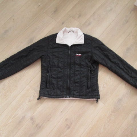 Kääntötakki. 60% polyesteria, 40% nylonia. Kai-kai 59, olka-helma 63. Musta/harmaa.