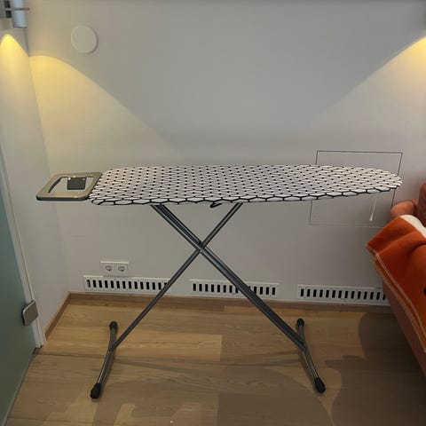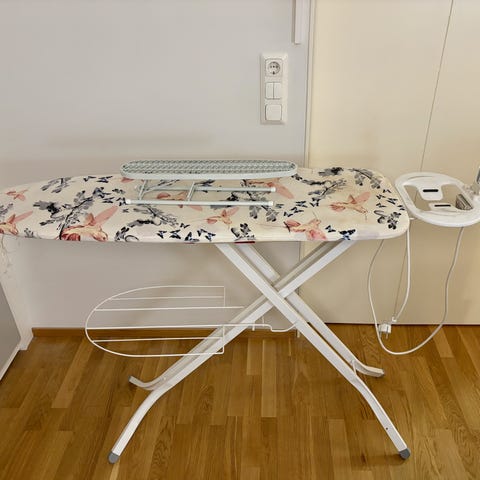 Leifheit silityslauta, jossa vaaleansininen pilvikuvioitu päällinen. Laudassa on integroitu pistorasia silitysraudalle ja johdonpidike. Korkeus on säädettävissä, ja metallirunko tarjoaa tukevan alustan silittämiseen. Sopii kotikäyttöön erilaisten vaatteiden ja tekstiilien silittämiseen.