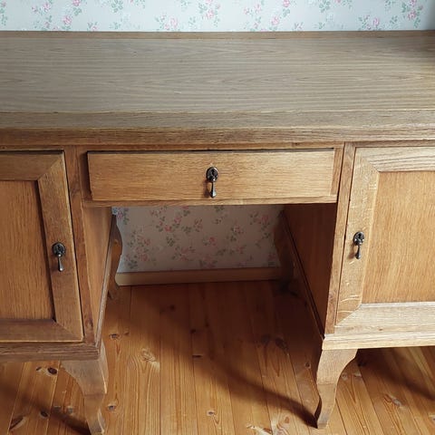 Vanha kirjoituspöytä. Pöydän kannessa ja reunoissa näkyy käytön jälkiä ja kulumaa. Vasemmalla sivulla on neljä päällekkäistä laatikkoa, oikealla sivulla kaksi laatikkoa sekä kaapillinen osa. Täyspuuta. 150 x 70cm.