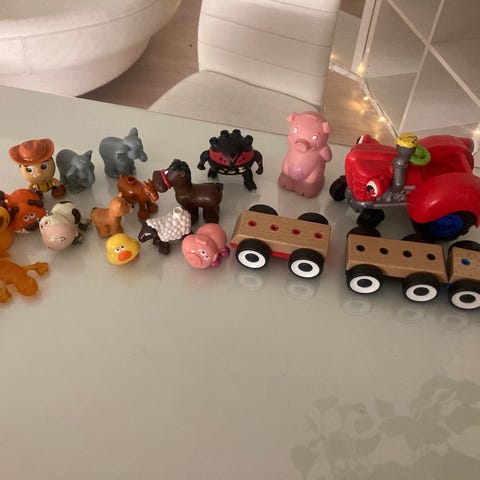 Hyväkuntoinen vedettävä kärry, jossa on rakennuspalikoita. Merkki: Ikea.