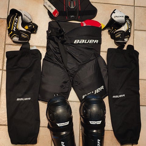 Vähällä käytöllä olleet jääkiekko kamat, sekä iso renkailla oleva varustelaukku