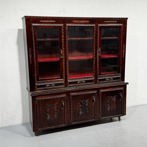 Korkea vitriinikaappi, jossa on lasiovet ja useita hyllyjä. Alhaalla on kaksi vetolaatikkoa ja kaappi. Kaapin pinta on tummanruskea.