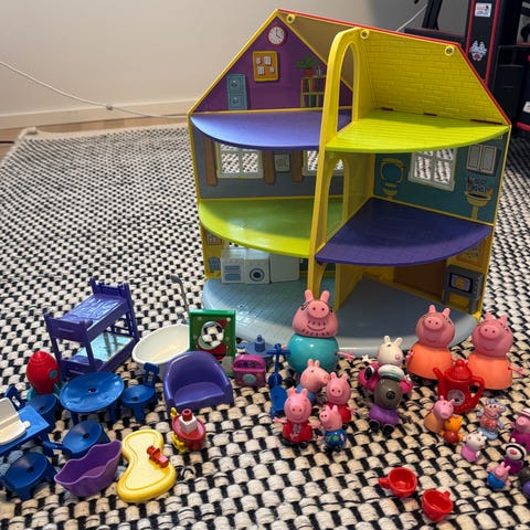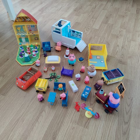 Myydään Pipsa Possun klubitalo ja siihen kuuluvat tavarat sekä 18 hahmoa ja muutamia niiden tavaroita + Pipsan perheen auto ja pappa koiran hinausauto. Tosi siisti kuntoisia ja vähän leikittyjä. Kuvasta poiketen myös Jyri possu hahmo kuuluu pakettiin.