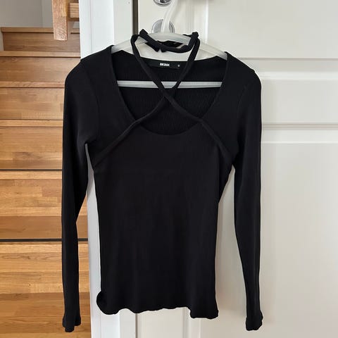 Musta napapaita pitkillä hihoilla. Helmassa, pääntiellä ja hihoissa söpö röyhelö viimeistely. Materiaali ehkä viskoosia, ohut ja pehmeä päällä.