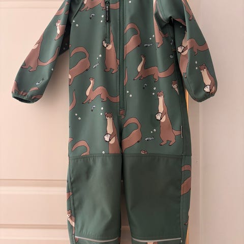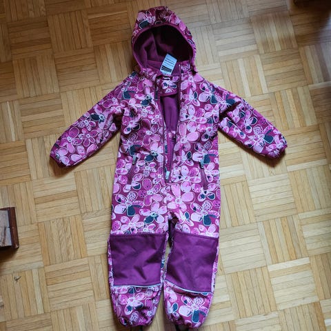 Myydään Jonathan softshell haalari kokoa 104. Toisessa polvessa pienet jäljet, näkyy kuvassa. Peppu on siisti, lähikuva viimeisenä. Huppu puuttuu.