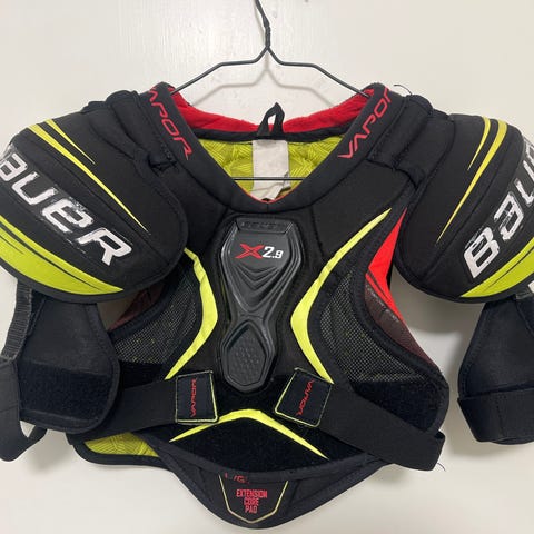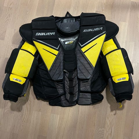 Bauerin 2x Pro kauden käytetty rintapanssari XL koossa. Kulumaa löytyy, mutta suojat ja tarrat ehjiä, sekä hyvässä kunnossa.