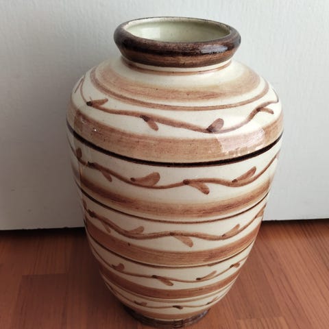 Korkeus 11cm halkaisija ylhäällä 5,5 cm alhaalla 6cm .Valmistettu noin 1960. Kunto hyvä Pohjassa FML