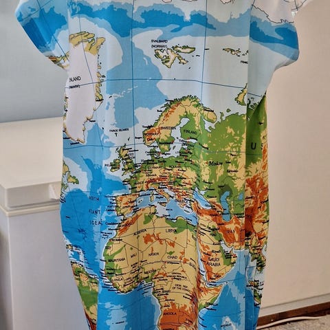 Myydään käyttämätön trikoomekko. Trikoo on puuvillaa, Marimekon kuosin nimeä en muista. Ompelijan valmistama.