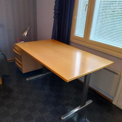 Pöydässä on pöytälevyyn upotettu integroitu pistorasiayksikkö, jossa on kolme maadoitettua pistorasiaa ja liitännät kaapelointia varten. Pöytä sopii työpisteeksi toimistoon tai kotiin, ja korkeussäätö mahdollistaa sekä istuma- että seisten työskentelyn. Pöydän tarkat mitat ovat 180 x 80 cm.
