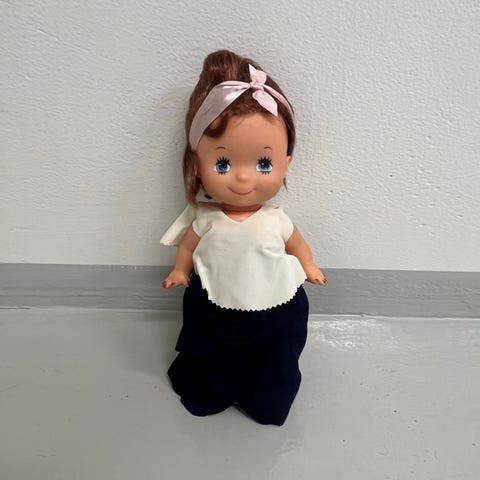 Nuken materiaali muovia. Nuken vaatteiden materiaaleista ei tietoa.