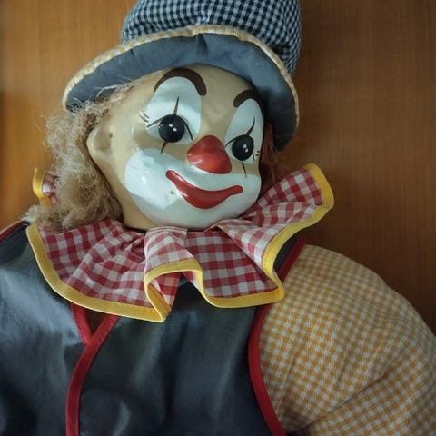 Selkäpuolella paidan alla nukessa saattaa olla jokin koneisto sisällä, joka ei toimi tällä hetkellä. Tämä selviää siitä, kun nukkea ravistaa. Katso kuvat.