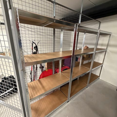 Laadukasta tukevaa varastohyllyä. Samaa mitä kaupassa käyttävät. Erittäin hyväkuntoista. 50e metri. Yhteensä noin 10m. Mukaan kuuluu jalat, taustalevyt, hyllyt, kannakkeet. Täysi paketti.