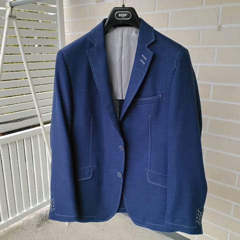 50% pellavaa, 27% villaa ja 23% polyesteriä. Hiekanvärinen pohja vaaleat ruudut. Hartian leveys 45,5cm. Rinnan ympärys ylemmän napin kohdalta 107cm. Pituus olalta helmaan 75cm. Hihan pituus olalta hihan suuhun 62 cm. Päällitaskujen tehtaan tikkauksia ei ole avattu. Kulkeutuu postissa 11 eurolla