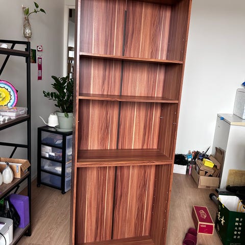 Pienillä pyörillä sujuvasti kulkeva metallinen hyllykkö kodin pienemmille tavaroille. Valmistaja ei ole selvillä. Sen koko on 59 cm (korkeus) x 41 cm (leveys) x 25 cm (pituus). Vaalea metallipinta on osittain irronnut, mutta toimivuuteen sillä ei ole vaikutusta. Sen saa hakea 4,5 eurolla.