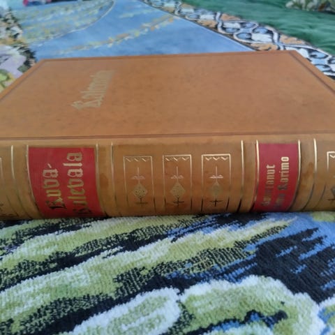 HYVÄKUNTOINEN (kuvat 2-3) kovakantinen kokonahkakansi, kokokuvio selkämyksessä