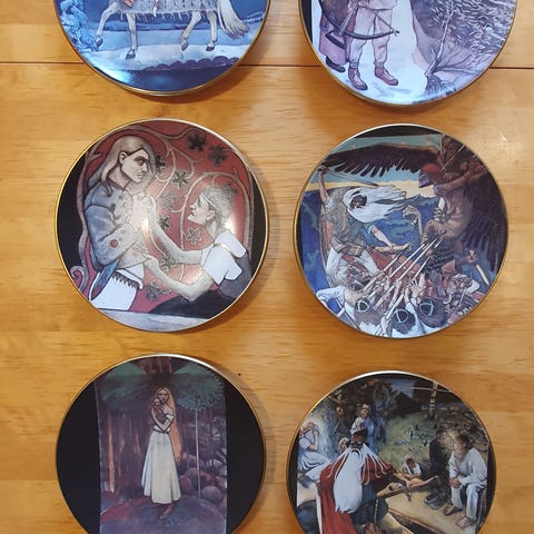 Arabia Akseli Gallen-Kallela Kalevala seinälautaset numerot 1-6.1. Kullervon sotaanlähtö. 2. Joukahaisen kosto. 3. Velisurmaaja. 4. Sampon puolustus. 5. Marjatta ja Kristuslapsi. 6. Väinämöisen lähtö.