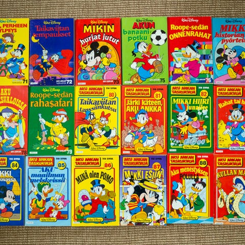 Aku Ankan taskukirja setti useita numeroita. Vaihteleva kunto, yhdestä numero 41 (Taikaviitta ensiesiintyminen) puuttuu kansi.