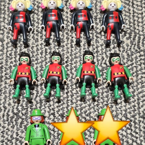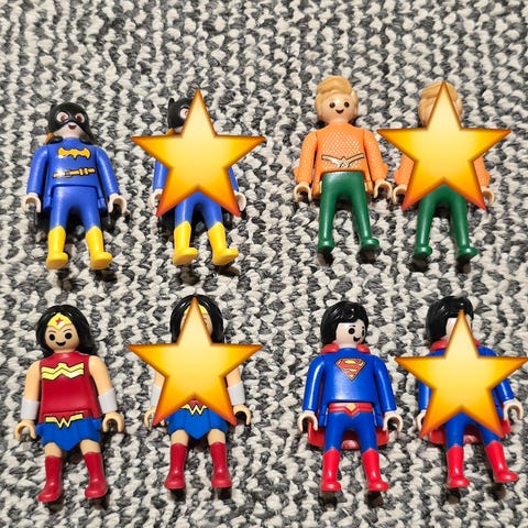 Tarjolla Kinder Playmobil hahmot 1 €/kpl: Green Lantern, Aquaman, Mera, Cyborg, Supergirl, Wonderwoman, Robin ja Batgirl. Mieluiten nouto Kalasatamasta.