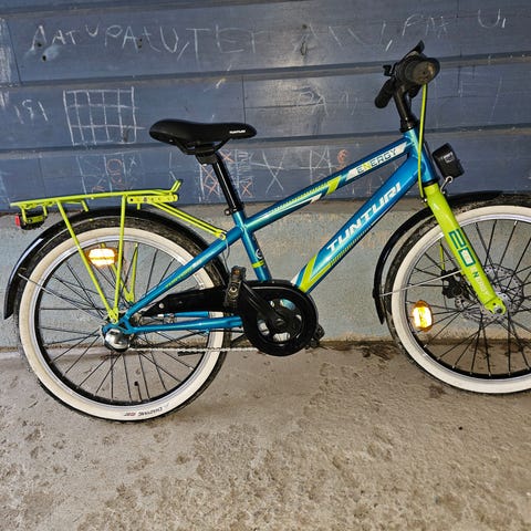Jämäkkä vaihteeton pyörä 20" renkailla. Lokasuojat on, että pysyy puhtaana ajaessa ja ketjunsuoja ettei mene kengännauhat ketjun väliin.