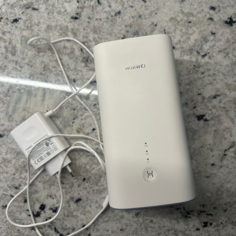 Huawei modeemi kiinteään tai mobiiliin verkkoyhteyteen. Laitteessa on virtaliitäntä, yksi Ethernet-portti ja yksi puhelinlinjaportti. Etupaneelissa on merkkivalot virralle, verkolle, WiFi-yhteydelle ja signaalille. Mukana virtalähde ja verkkokaapeli. Valkoinen pöytämallinen laite koti- tai toimistokäyttöön.
