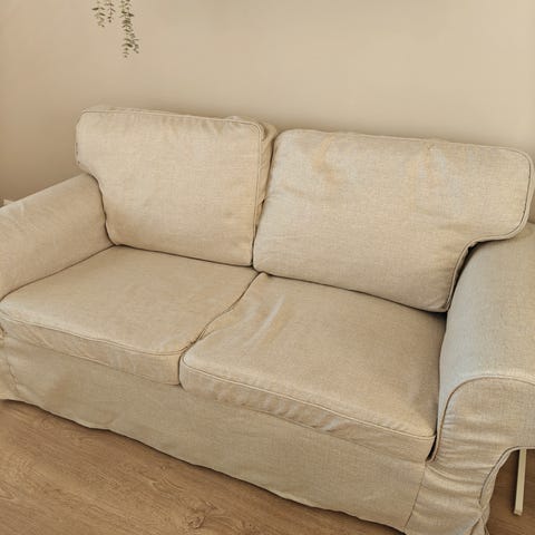 IKEA Ektorp 2 hengen sohva, sohva 10v vanha. Uudet päälliset Kilanda tummansininen hankittu 12/2025 ja päälliset ovat erinomaisessa kunnossa. Runko hieman natisee mutta on mukava istua ja muita kulumia ei ole. Istuin ja selkätyynyissä vanhat päälliset vielä paikoillaan koska osassa tyynyistä on suojakangas haljennut ja höyhenet päässeet liikkumaan. On koirataloudessa (hypoallerginen rotu).