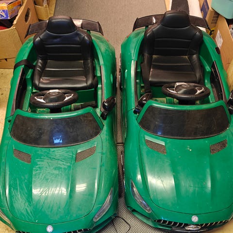 Myydään pieneksi jäänyt sähköauto, toimiva. Juuri kokeiltu akulla, että toimii. Akku ei kuulu kauppaan. Äänet toimii, oikea radio ja muutamat valmiit musiikit. Kaukosäädin löytyi, sen toimivuudesta ei tietoa, saa tietysti mukaan. Ylävalot toimii, yksi lamppu vaatii uudelleen kiinnitystä. Etuvalon suojamuovi halki, näkyy kuvissa. Perus käytönjälkiä näkyy. Seuraavalle kruisailijalle oiva peli :) Hieman hiekkaa pohjalla, puhdistus jää seuraavalle.