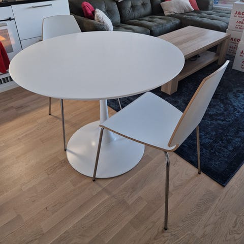 Jysk pyöreä ruokapöytä. Pöytä on käsitelty puuvahalla mustaksi ja päällä on kosteussuoja. Pinta- ja reunakohdissa on käytön jälkiä ja naarmuja, jotka näkyvät kuvissa. Sopii ruokailu- tai oleskelutilaan useamman tuolin kanssa käytettäväksi. Halkaisija 120cm.