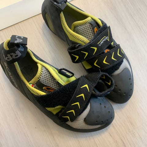 Käyttökertoja noin 10 eli erittäin vähän käytetyt ja hyväkuntoiset kiipeilykengät.