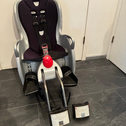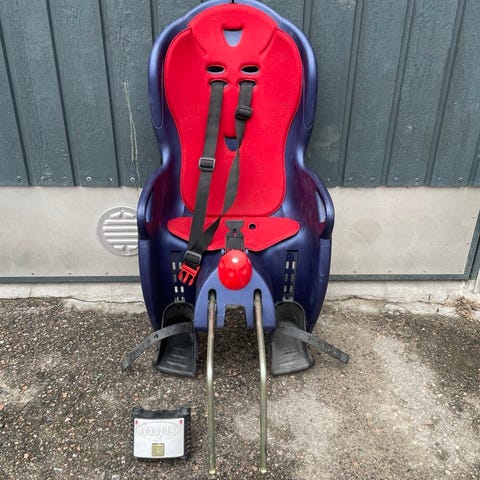 Hamax Sleepy lasten polkupyörän istuin. Istuin on kallistettava. Käyttö 22 kg:n painorajaan asti. Istuimessa on selkänoja, turvavyöt ja jalkatuet. Kiinnitys pyörän runkoon mukana olevalla telineellä. Väri tummansininen punaisella pehmusteella. Soveltuu lapsen kuljettamiseen aikuisen polkupyörässä. Kunto ok, heijastin hukkunut takaa ajan saatossa. Nouto Kauniaisista.