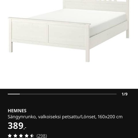 IKEA Hemnes sängynrunko, koko 180x200 cm. Väri valkoinen. Puinen runko, jossa korkea pääty säleikkömallilla. Sopii 180x200 cm patjalle. Rungon tyyli on pelkistetty ja suoraviivainen, sopii monenlaiseen makuuhuoneeseen. Patja ei kuulu kauppaan. Ikealla ei oo enään myynnissä tän kokoista runkoa. Käytön jälkiä jonkun verran siellä sun täällä mutta on hyväkuntoinen ja siisti.