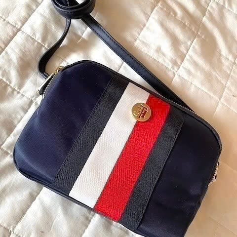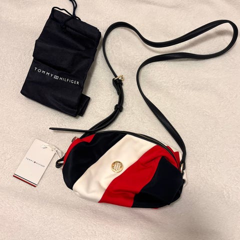 Tommy Hilfiger olkalaukku naisille. Materiaalina kangas, jossa musta-valkoinen TH-kuviointi ja edessä tunnusomainen raita. Laukussa on säädettävä leveä olkahihna. Pääosasto suljetaan vetoketjulla, ja sisällä on vetoketjutasku sekä pieniä avotaskuja pienten tavaroiden säilytykseen. Sopii arjen peruslaukuksi tai mukaan esimerkiksi kaupungille ja matkoille.
