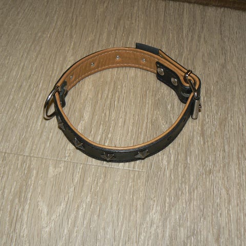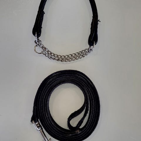 Myydään pienen koiran puolikuristava nahkainen kaulapanta ja talutushihna.