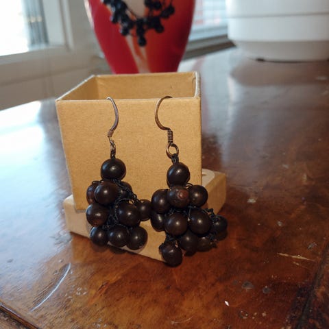 Käyttämättömät mustat kevyet korvakorut, 4 paria. Kukkaympyrän halkaisija 5 cm puuta ja salmiakkien pituus 5,5 cm puuta. Sydänten ja vaahteranlehtien leveys 3,5 cm, molemmat muovia. Myyn mielelläni settinä.