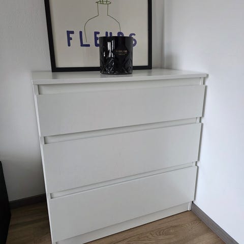 Nyt halvalla muuton tieltä Ikea Malm lipasto. Kahden alimman laatikon päältä irronnut peitelevyt. Pientä käytön jälkeä mutta ei mitään isompaa kolhua ja muuten täysin toimiva.