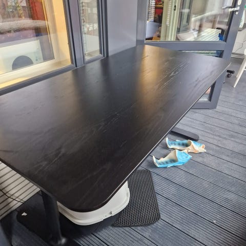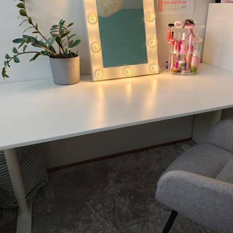 IKEAn säädettävä 160x80 Bekant työpöytä, jonka alapuolella verkko, johon saa johdot kätevästi. Pöydän korkeus on säädettävissä manuaalisesti 65-85cm välillä, mutta tämä ei ole sähköpöytä. Kannessa yksi pieni jälki, joka on kuvattu erikseen. Muuten todella siisti ja hyvässä kunnossa. On nykyiseen makuuhuoneeseen liian iso ja siksi myydään.