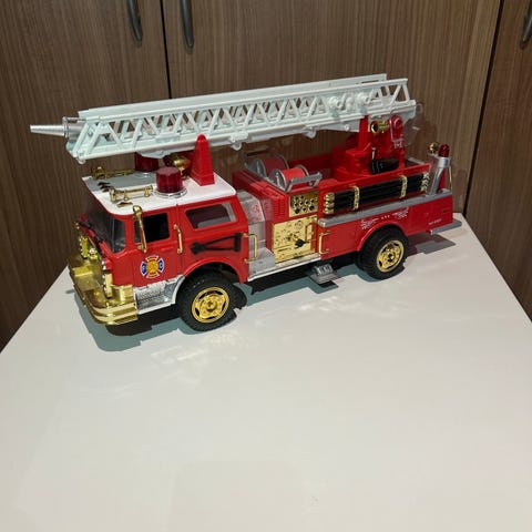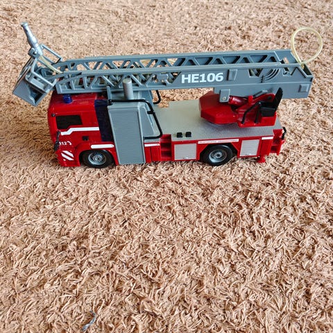 Punainen muovinen paloauto, jossa on säätyvä tikasvarsi ja neljä erilaista ääni/valotehostetta. Kuusipyöräinen malli ja takana avoin varustetila. Ollut sisäleikeissä, korissa ja osissa käytön jälkiä. Sopii leikkeihin paloautoista kiinnostuneille tai keräilykoristeeksi.