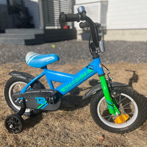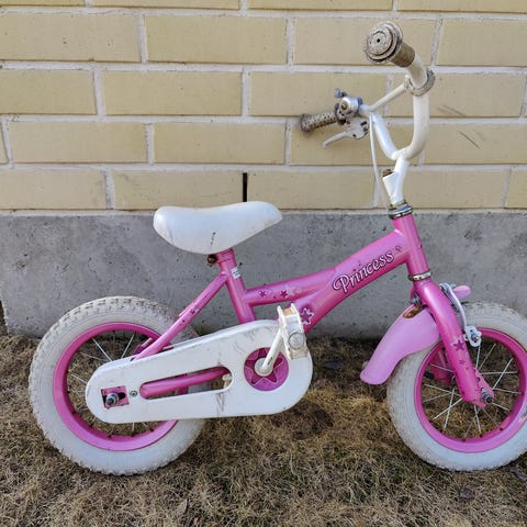 White lasten polkupyörä 12" renkailla. Rungon väri turkoosi ja satula sekä lokasuojat ovat vaaleat. Pyörässä on jalkajarru ja käsijarru, ketjusuoja ja heijastimet. Takalokasuoja rikki. Sopii pienelle lapselle ensimmäiseksi pyöräksi.